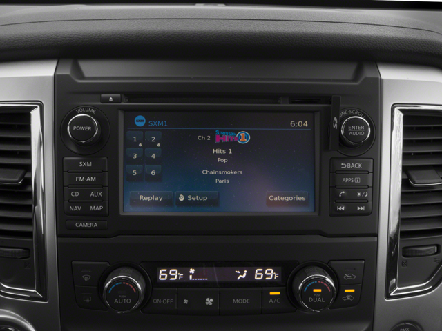 6 Speakers, 7-Pin Wiring Harness Connector (Rear Bumper), Air Conditioning, AM/FM radio: SiriusXM, Auto-Dimming Rear-View Mirror w/Compass, Automatic On/Off Headlights, Blind Spot Warning w/Rear Cross Traffic Alert, Carpeted Floor Mats (4 Piece), CD player, Chrome Interior Door Locks, Cloth Seat Trim, Convex Spotter Mirror, Driver door bin, Driver vanity mirror, Dual Zone Automatic HVAC, Fog Lamp, Front & Rear Parking Sensors, Front Manual Split Bench Seat (40/20/40), Front reading lights, Illuminated entry, Intelligent Key System, Leather Wrapped Steering Wheel, Painted Rear Bumper, Power Sliding Rear Window w/Defogger, Power steering, Power windows, Radio data system, Radio: NissanConnect w/Navigation & Mobile Apps, Radio: NissanConnect w/SiriusXM & Mobile Apps, Rain Sensing Wipers, Rear window defroster, Rearview Monitor, Receiver Hitch, Remote keyless entry, Siri Eyes Free, Splash Guards, Steering wheel mounted audio controls, Step Rails, SV Comfort & Convenience Package, Turn signal indicator mirrors, Universal Garage Door Opener.