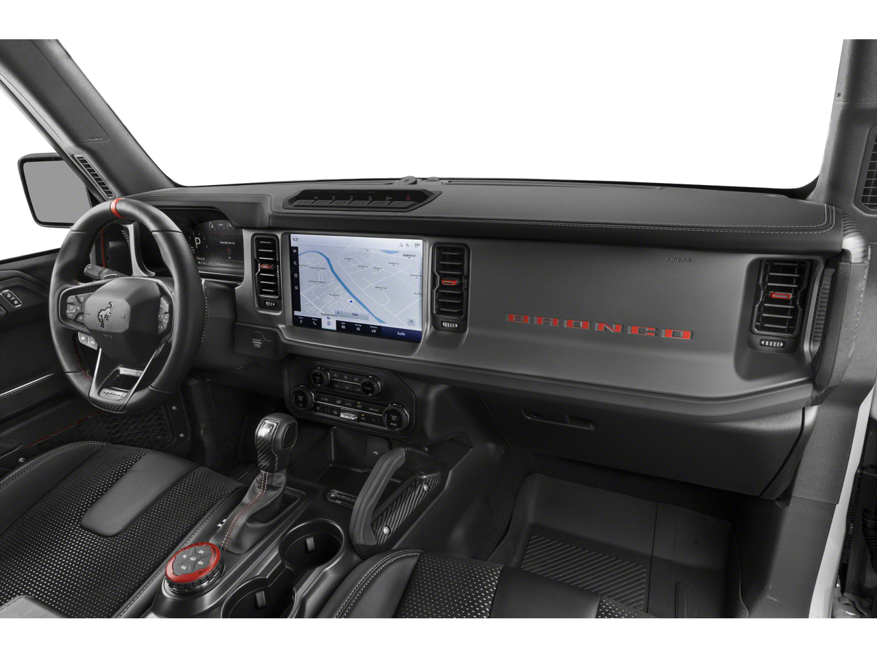 This 2023 Ford Bronco Raptor in Shadow Black includes the following features: 3.0L EcoBoost V6 10-Speed Automatic 4WD Equipment Group 374A Lux Package, Lux Package (10 Speakers w/Subwoofer, 2 Smart Charging USB Ports In Dashboard, Adaptive Cruise Control, Evasive Steering Assist, Heated Steering Wheel, Radio: B&O Sound System by Bang & Olufsen, Universal Garage Door Opener, Wireless Charging Pad, and Connected Built-In Navigation), 7 Speakers, AM/FM radio: SiriusXM with 360L, AM/FM Stereo, Connected Navigation, Convertible HardTop, Heated door mirrors, Navigation system: Connected Navigation, Off-Road Assistance Kit (DIO), Power door mirrors, Radio data system, Second Row Panel Roof Bag Storage (DIO), SiriusXM Radio w/360L, SYNC 4, Turn signal indicator mirrors, Upgraded Raptor Graphic, 4-Wheel Disc Brakes, 4.7 Axle Ratio, ABS brakes, Air Conditioning, Alloy wheels, Auto High-beam Headlights, Auto-dimming Rear-View mirror, Automatic temperature control, Brake assist, Compass, Convertible roof lining, Delay-off headlights, Driver door bin, Driver vanity mirror, Dual front impact airbags, Dual front side impact airbags, Electronic Stability Control, Emergency communication system: 911 Assist, Exterior Parking Camera Rear, Front anti-roll bar, Front Bucket Seats, Front Center Armrest, Front dual zone A/C, Front fog lights, Front reading lights, Front wheel independent suspension, Fully automatic headlights, Glass rear window, Hard Top Sound Deadening Headliner (DISC), Heated front seats, Illuminated entry, Integrated roll-over protection, Interior Carbon Fiber Pack 6, Leather Shift Knob, Low tire pressure warning, Marine Grade Vinyl Bucket Seats, Occupant sensing airbag, Outside temperature display, Overhead airbag, Overhead console, Panic alarm, Passenger door bin, Passenger vanity mirror, Power steering, Power windows, Rear anti-roll bar, Rear seat center armrest, Rear window defroster, Rear window wiper, Remote keyless entry, Security system, Speed control, Split folding rear seat, Steering wheel mounted audio controls, Tachometer, Telescoping steering wheel, Tilt steering wheel, Traction control, Trip computer, Variably intermittent wipers, Voltmeter, Wheel Lock Kit (DIO), and Wheels: 17 Black High Gloss-Painted Aluminum. Recent Arrival! Odometer is 5379 miles below market average!